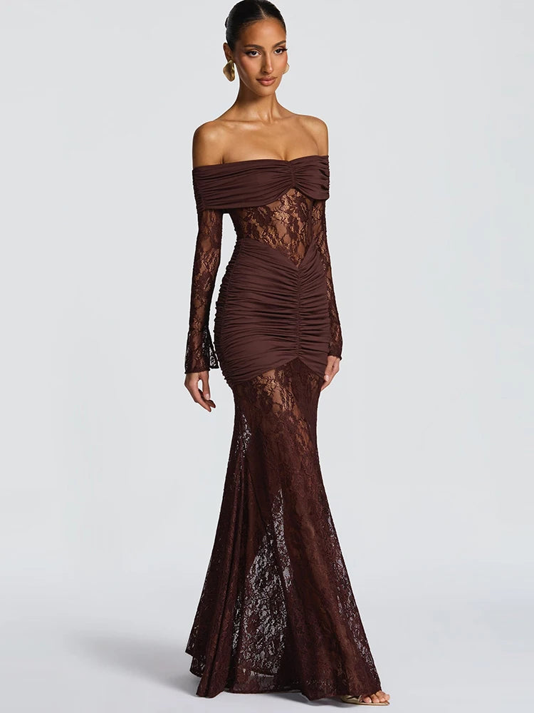 - details: off shoulder, ankle length, long sleeve, ruched, partially sheer